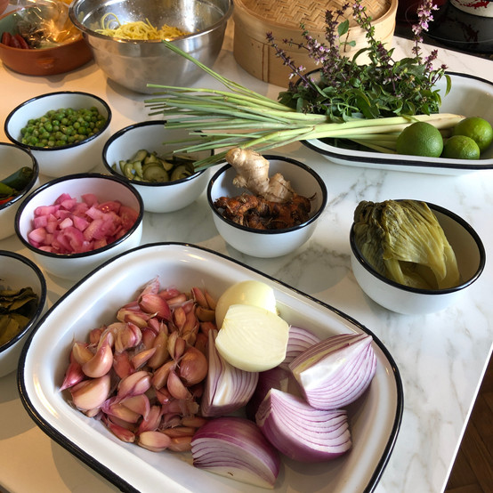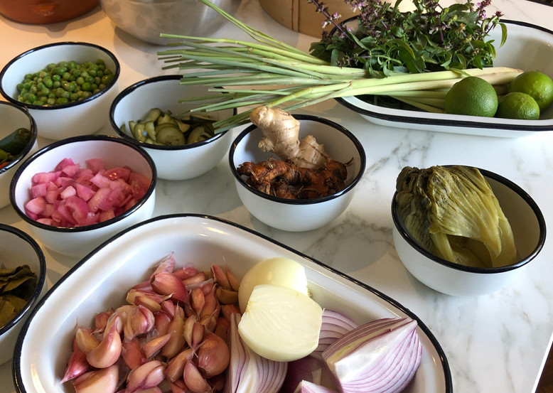 Uso de ingredientes y utensilios de la cocina clásica tailandesa: Pok pok, chiles, salsa de pescado, pasta de camarones, galanga, lemongrass y entre otros.
